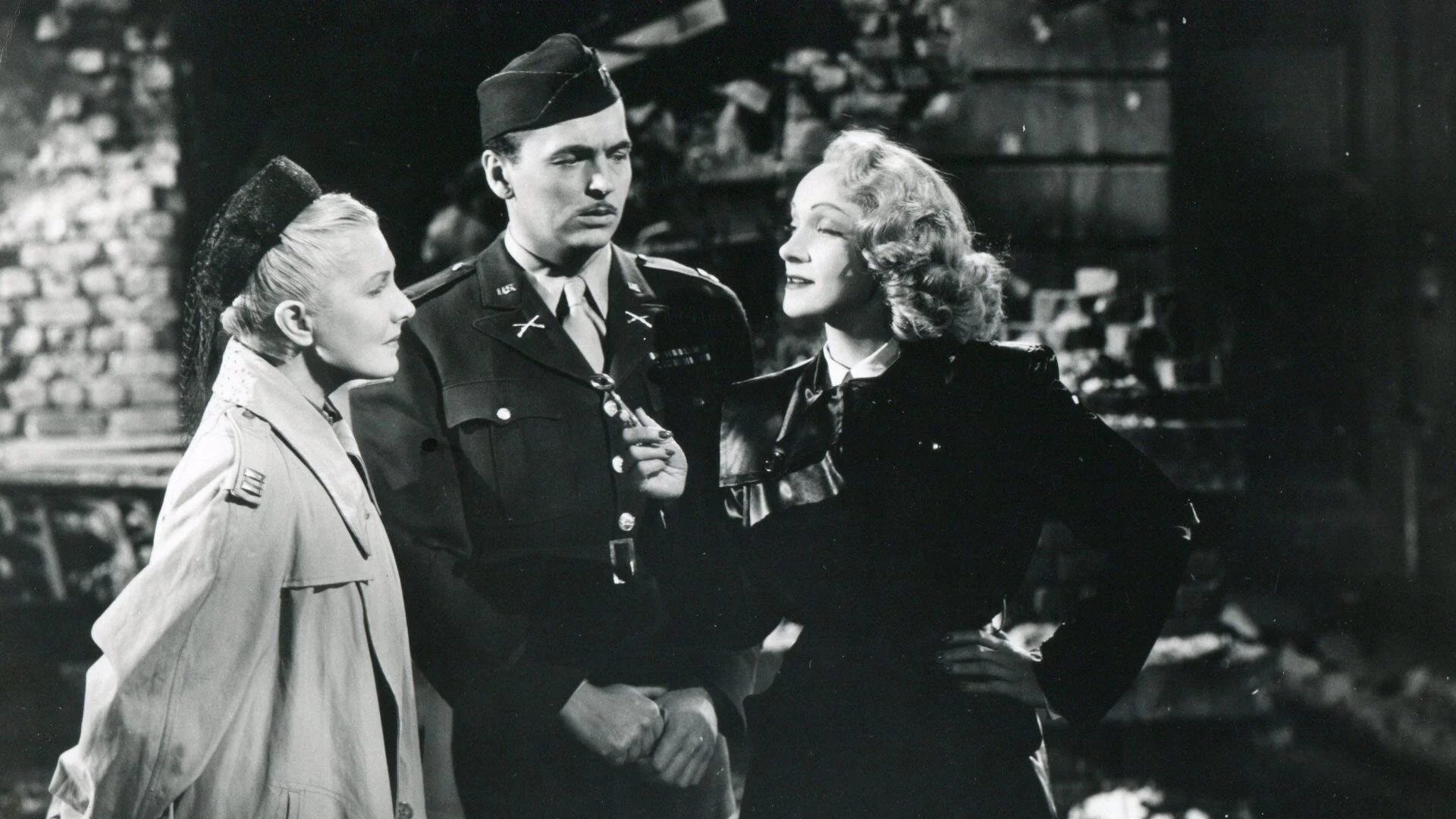 A dedicated Iowa congresswoman (Jean Arthur) visits Berlin to observe the troops’ morale in now occupied, post-war Berlin. With the less than tactful help of her military escort (John Lund), Congresswoman Frost finds a world where the troops fraternize with frauleins, trade at the black market, and flock to see a nightclub singer (Marlene Dietrich) who may have been connected with the upper Nazi echelons.